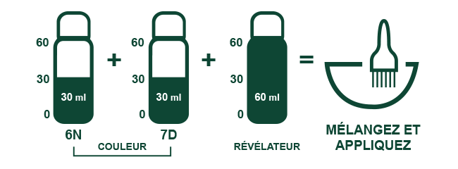 Vous pouvez créer votre propre couleur sur-mesure pour un look personnel et stylé en mélangeant deux ou plusieurs nuances entre elles. La seule règle à respecter est le ratio de mélange 1 : 1. Ce qui équivaut à dire que la quantité totale en ml du colorant (flacon 1 des nuances choisies) doit être égal à la quantité en ml de révélateur (flacon 2). Par exemple, ma couleur est 6N mais je veux donner à ma chevelure un reflet doré. Je mélange 30 ml de la couleur 6N + 30 ml de la couleur 7D flacon 1) avec 60 ml de révélateur (flacon 2).