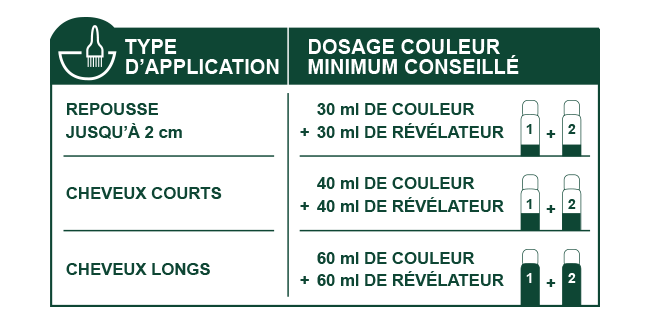 La quantité de produit dépend de la longueur, l’épaisseur ou la porosité de vos cheveux, mais l’important est de respecter le ratio de mélange 1 : 1 entre couleur et révélateur. Le tableau ci-dessous vous servira de guide pour un dosage approprié et éviter le gaspillage. En l’absence de verre doseur, vous pouvez utiliser les bouchons pour doser la couleur et le révélateur en quantités égales.